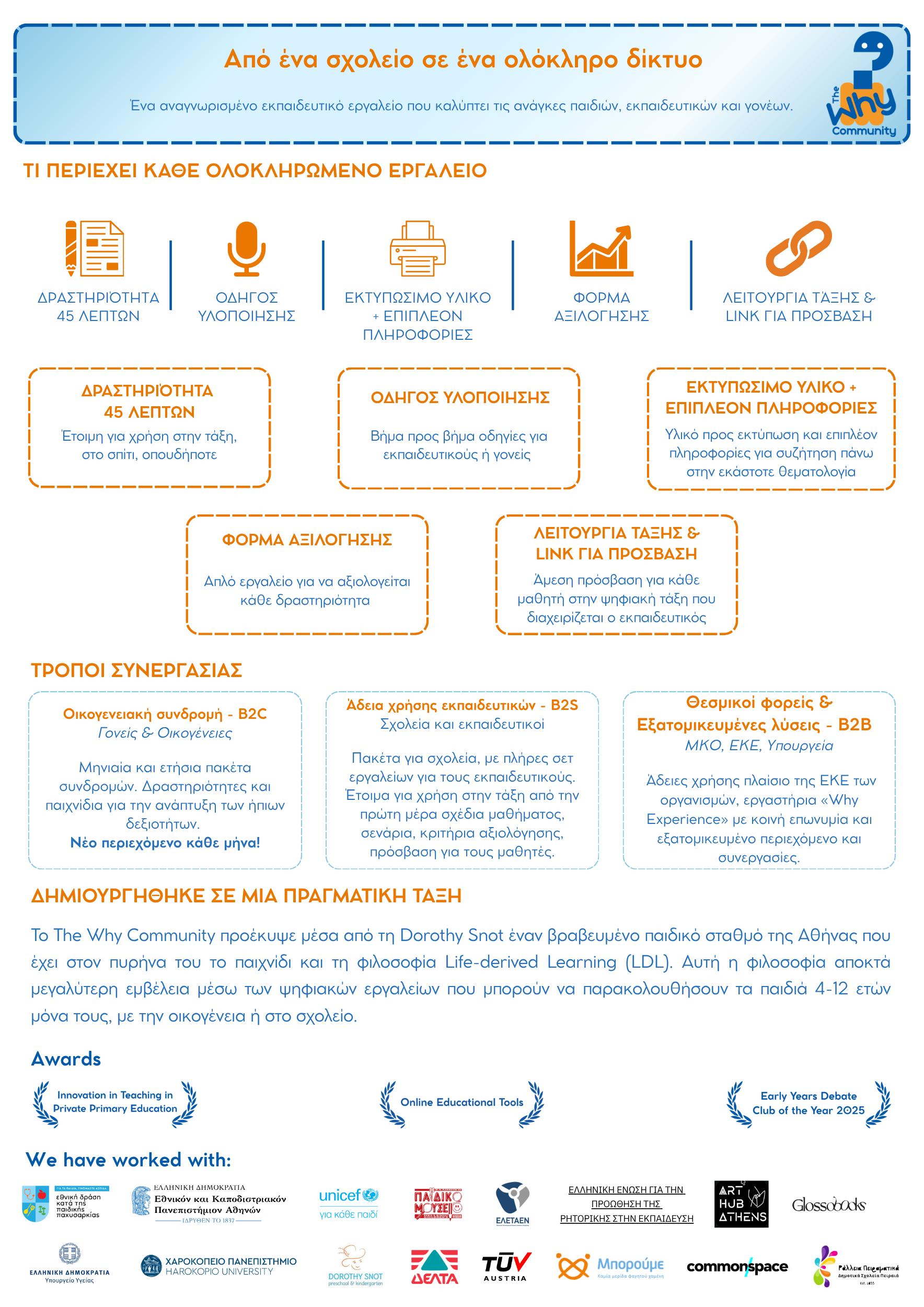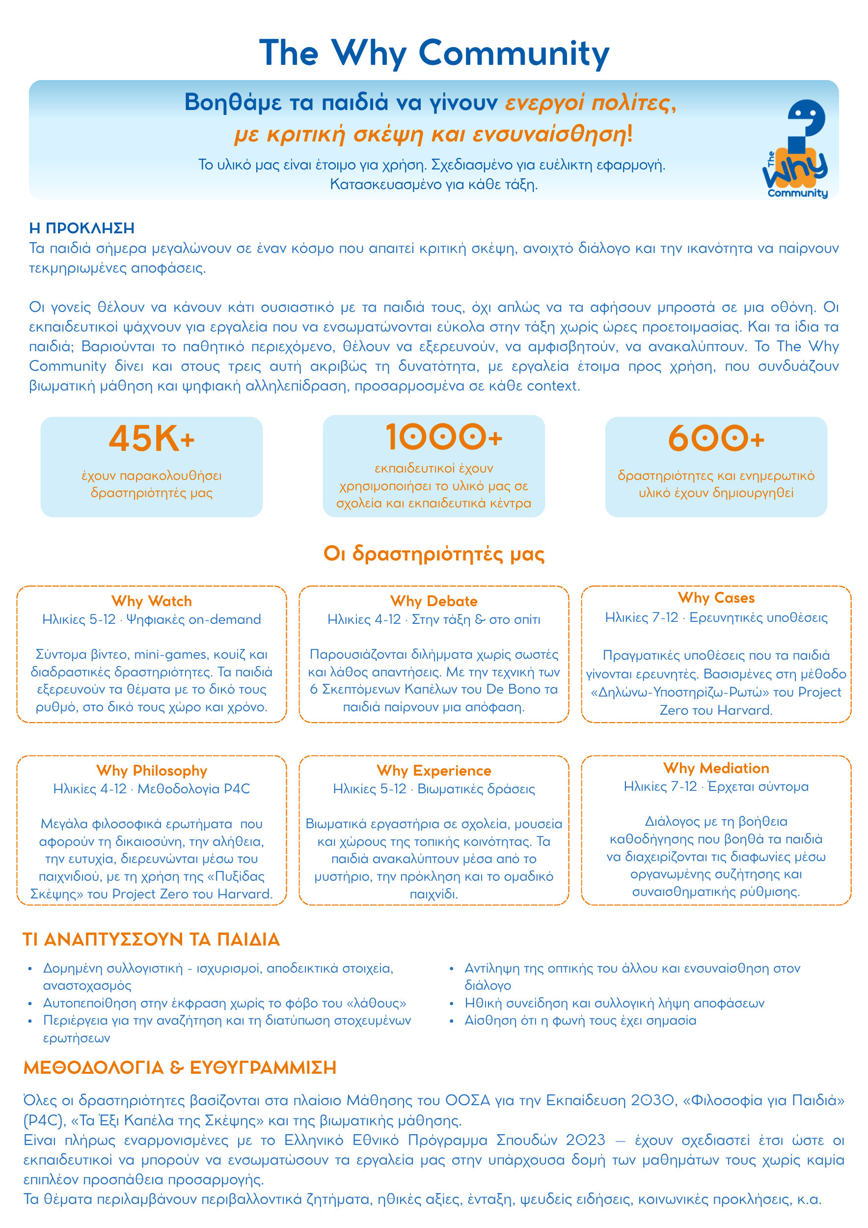 Το The Why Community σχεδιάζει εργαλεία βιωματικής μάθησης που βοηθούν τα παιδιά ηλικίας 4–12 ετών να αναπτύξουν κριτική σκέψη, ενσυναίσθηση και ηθική λογική μέσω του διαλόγου, των διλημμάτων και της εξερεύνησης του πραγματικού κόσμου.